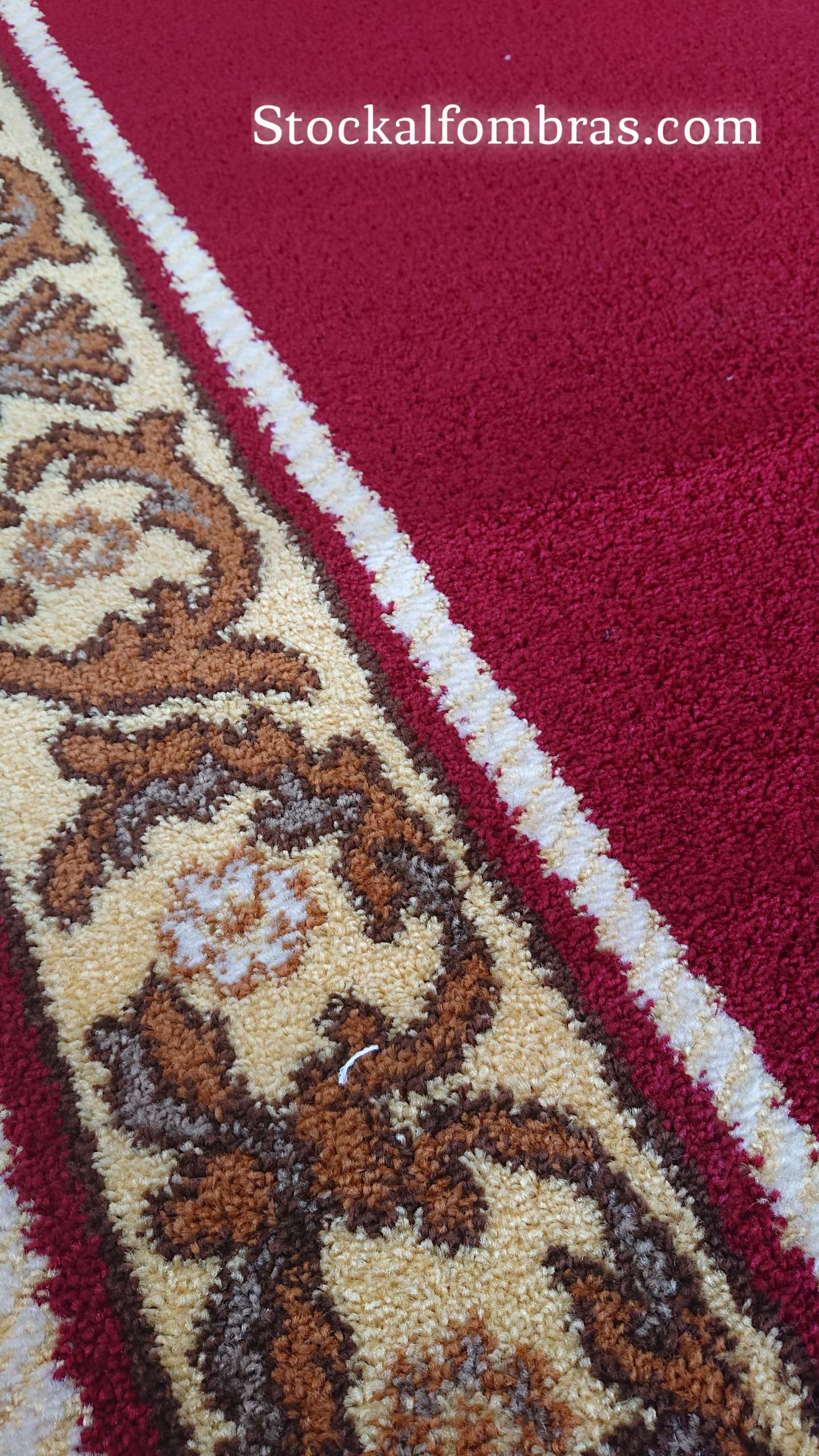 Esta alfombra se fabrica en 2.75 cm de ancho en color rojo con cenefa dorada.